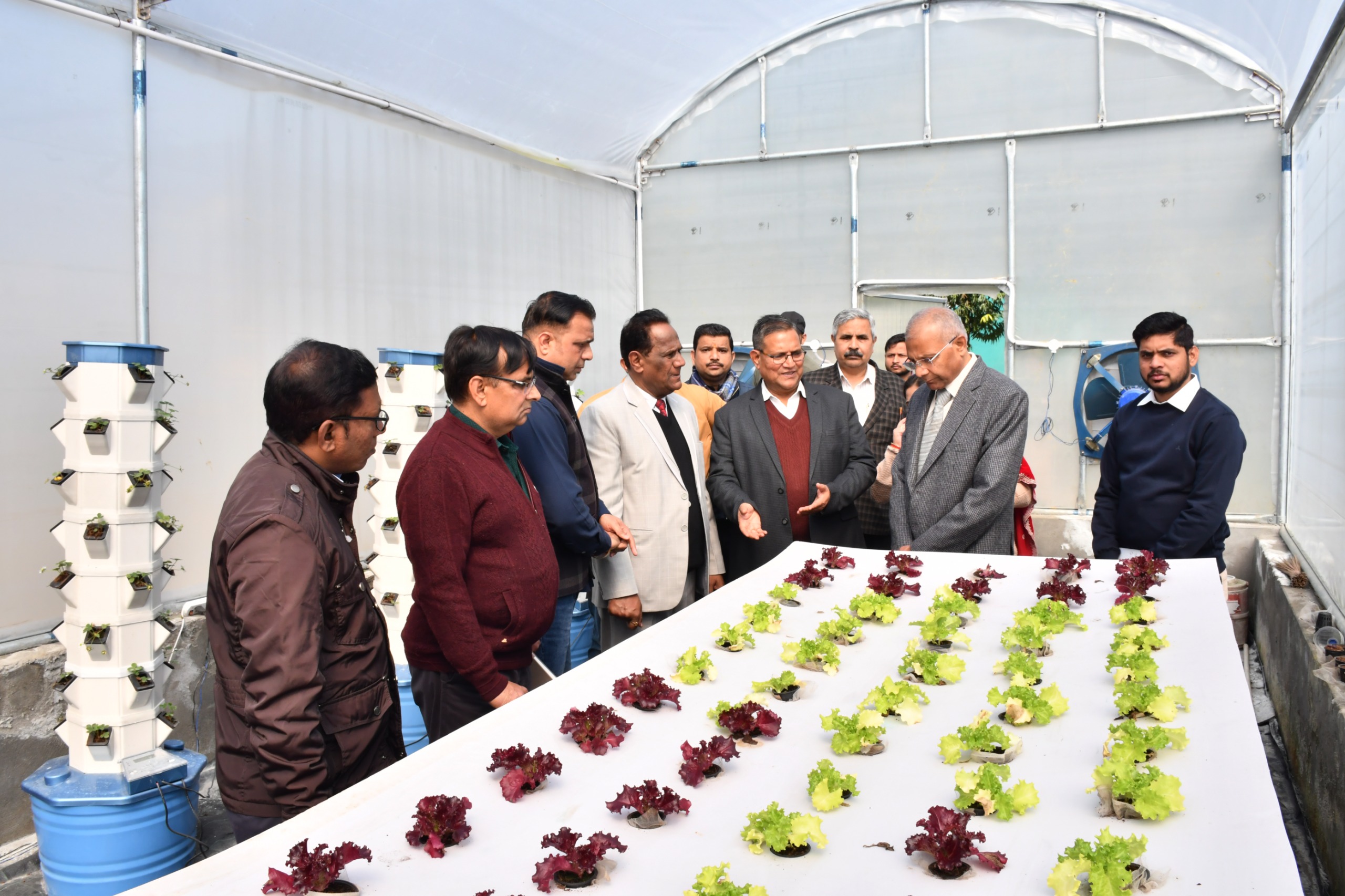 सरदार वल्लभभाई पटेल कृषि एवं प्रौद्योगिकी विश्वविद्यालय में आज कुलपति ने कॉलेज ऑफ हॉर्टिकल्चर का निरीक्षण किया, वहां पर चल रहे शोध कार्यों का अवलोकन किया। कॉलेज ऑफ हॉर्टिकल्चर में उन्होंने हाईटेक नर्सरी, जिसमें लौकी, खीरा, बैंगन और टमाटर का उत्पादन किया जा रहा है, उसका अवलोकन किया। इसके अलावा हाइड्रोपोनिक तकनीक द्वारा सलाद पत्ता एवं वर्टिकल फार्मिंग द्वारा स्ट्रॉबेरी के उत्पादन को देखा। हर्बल गार्डन गार्डन का भ्रमण करने के दौरान कुलपति ने और अधिक हर्बल पौधों का उत्पादन करने और इसको पौधों को न्यूनतम दर पर किसानों को उपलब्ध कराने के लिए निर्देश दिए।